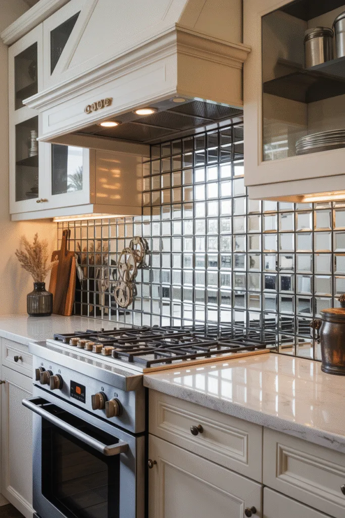 Mirrored tiles create a glamorous, light-reflecting backsplash that makes small kitchens feel more spacious. Available in antique, smoked, or clear finishes, these tiles add a touch of Hollywood Regency style. They pair beautifully with quartz countertops and sleek cabinetry, creating a luxurious aesthetic. While mirrored tiles are prone to smudges and require regular cleaning, their reflective quality enhances lighting and adds depth. This backsplash idea is perfect for those who want a bold, elegant statement.