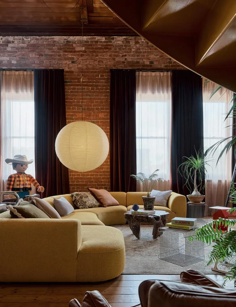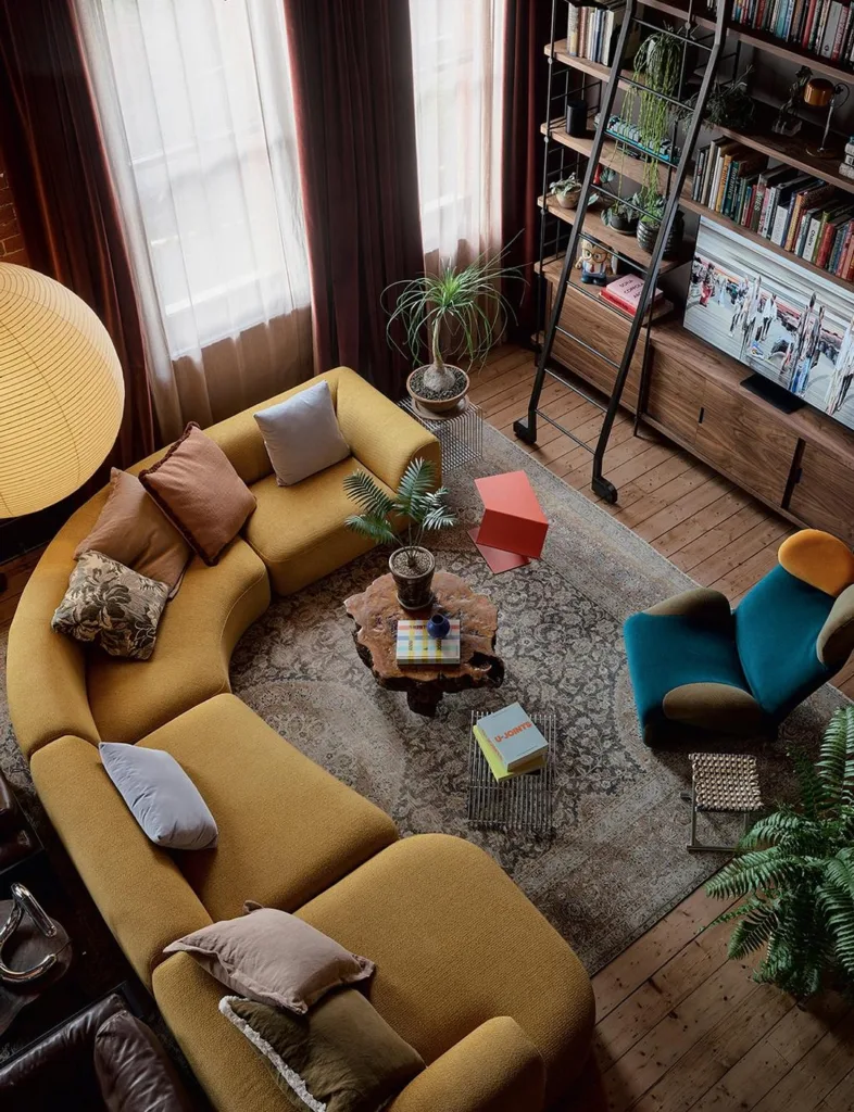 A curvy 1970s sofa reupholstered in emerald or mustard becomes the room’s anchor. Contrast with a lucite coffee table to keep sightlines open.