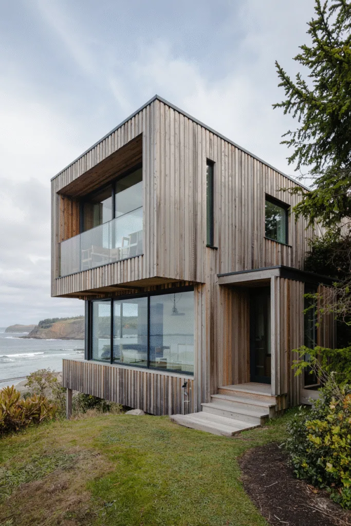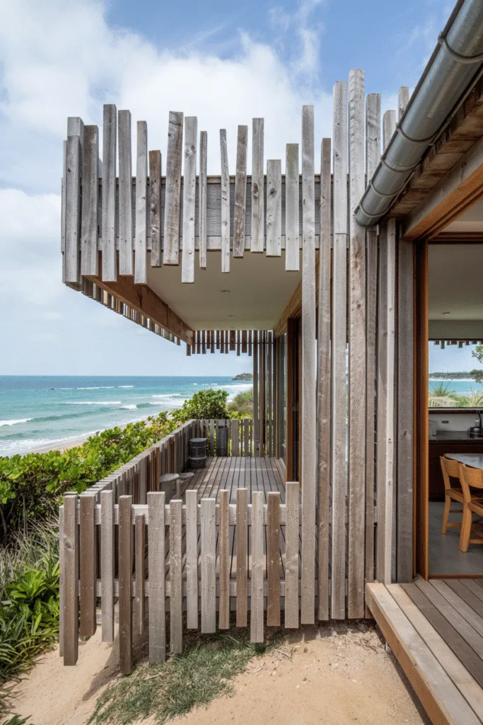 Perched along a rugged coastline, this house features weathered cedar slats that mimic the natural driftwood found nearby. The slats are arranged with varying gaps to promote airflow, essential for humid coastal climates. The design incorporates a cantilevered deck, where the vertical cladding extends to form a shaded outdoor area, blending indoor and outdoor living seamlessly.