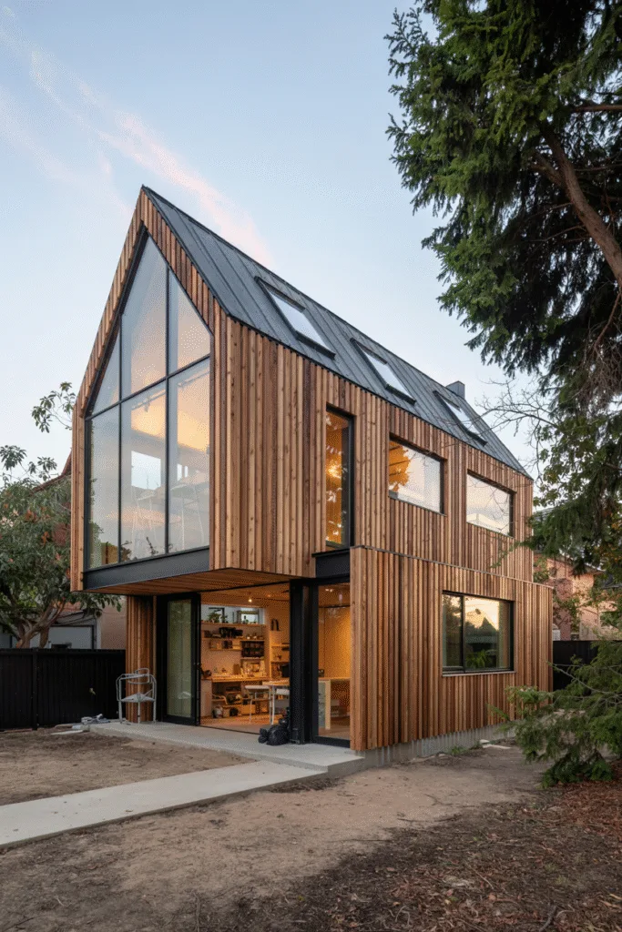 Designed for a creative professional, this house doubles as a studio with vertical timber slats that serve as both cladding and a sculptural element. The slats are arranged in a rhythmic pattern, creating a dynamic facade that changes with the light. Large skylights illuminate the interior workspace, blending form and function.