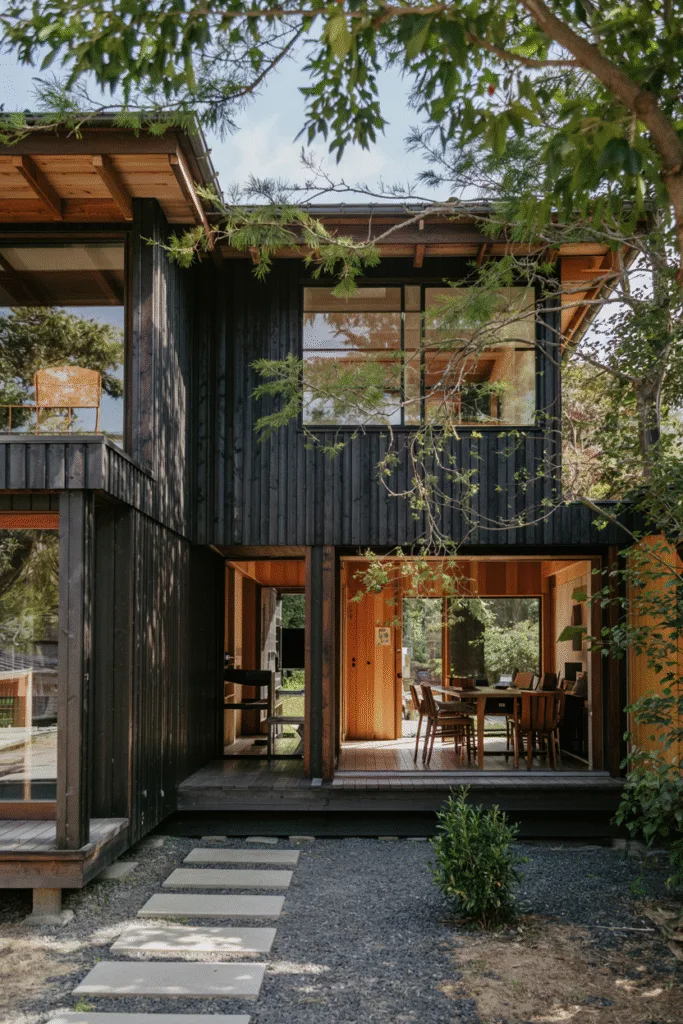 Drawing from Japanese architecture, this house uses charred cedar slats (shou sugi ban) for a dramatic, blackened facade. The vertical slats create a sense of calm and order, while sliding screens allow for flexible light and privacy control. A minimalist courtyard complements the design, emphasizing tranquility.