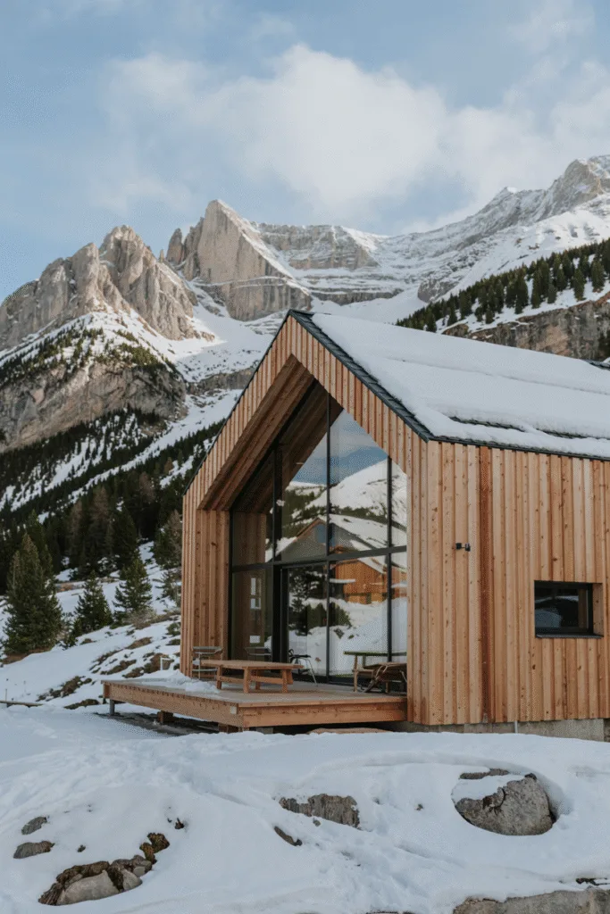 High in the mountains, this chalet uses vertical spruce slats to create a striking contrast against snowy peaks. The slats are treated with a protective sealant to withstand harsh winters, while their vertical orientation helps shed snow easily. Floor-to-ceiling glass walls offer breathtaking views, with the slats framing the landscape like a natural canvas.