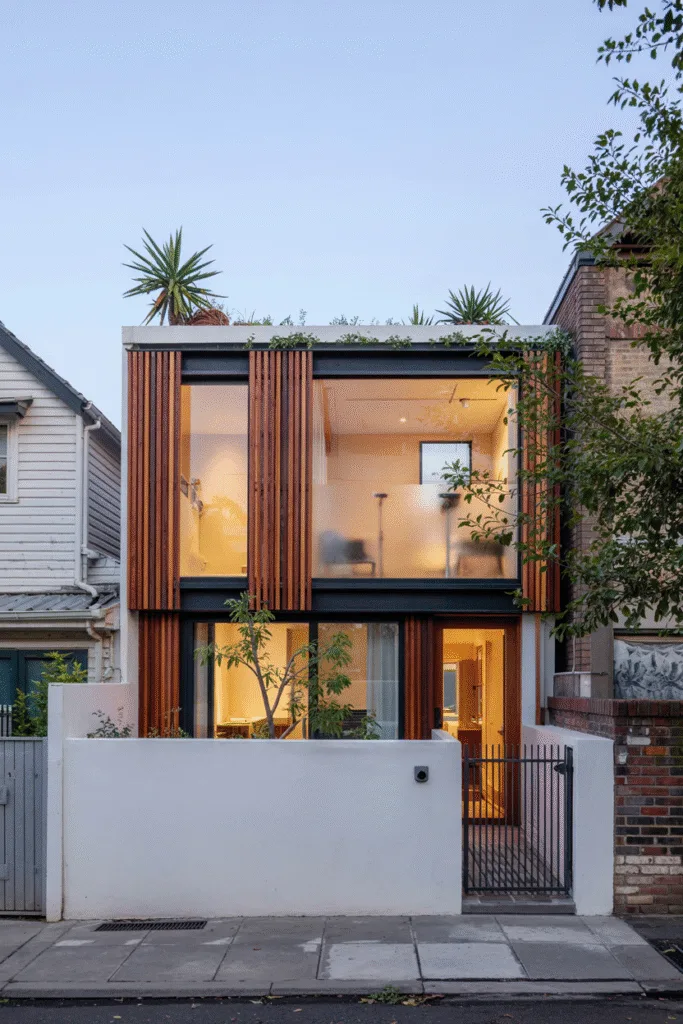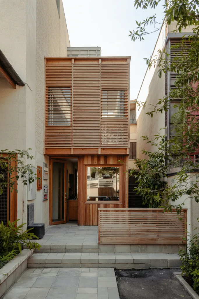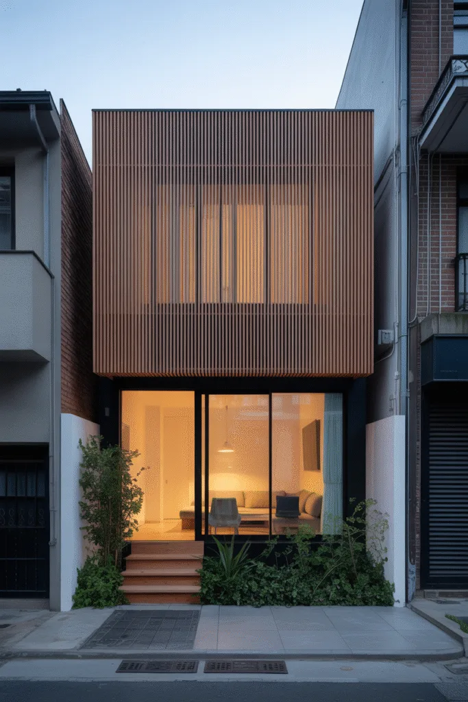 Nestled in a bustling city, this compact two-story home uses sleek cedar slats to create a serene facade. The vertical lines draw the eye upward, making the house appear taller and more spacious. The slats are spaced tightly to ensure privacy while allowing diffused light to filter into the interiors, creating a warm, inviting glow. Paired with large glass windows, the design balances openness and seclusion, perfect for urban dwellers seeking a modern oasis.