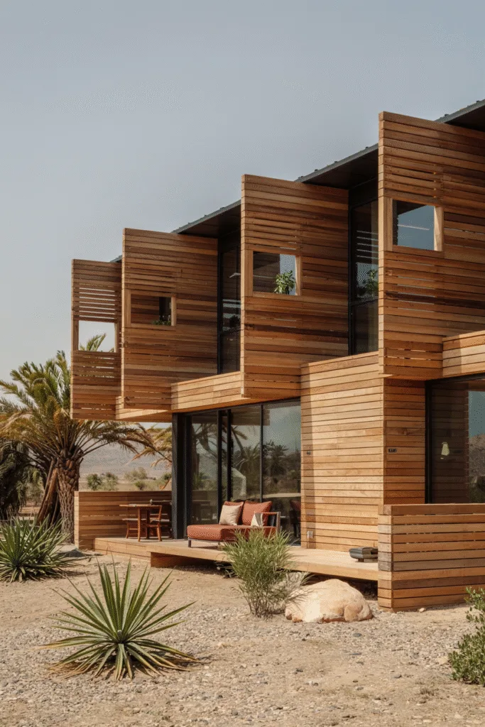 In an arid landscape, this house employs thermally modified timber slats to withstand extreme heat. The slats are arranged in a staggered pattern, casting intricate shadows that shift throughout the day. The facade integrates solar panels discreetly, combining sustainability with a sleek, futuristic aesthetic.
