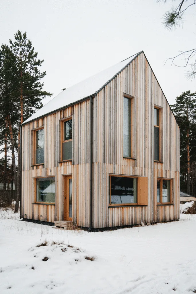 Inspired by Nordic design, this house uses pale pine slats treated with a light wash to enhance the wood’s natural grain. The minimalist facade is punctuated by asymmetrical windows, creating a playful yet sophisticated look. The vertical slats wrap around corners, giving the house a cohesive, sculptural quality that stands out in its snowy surroundings.