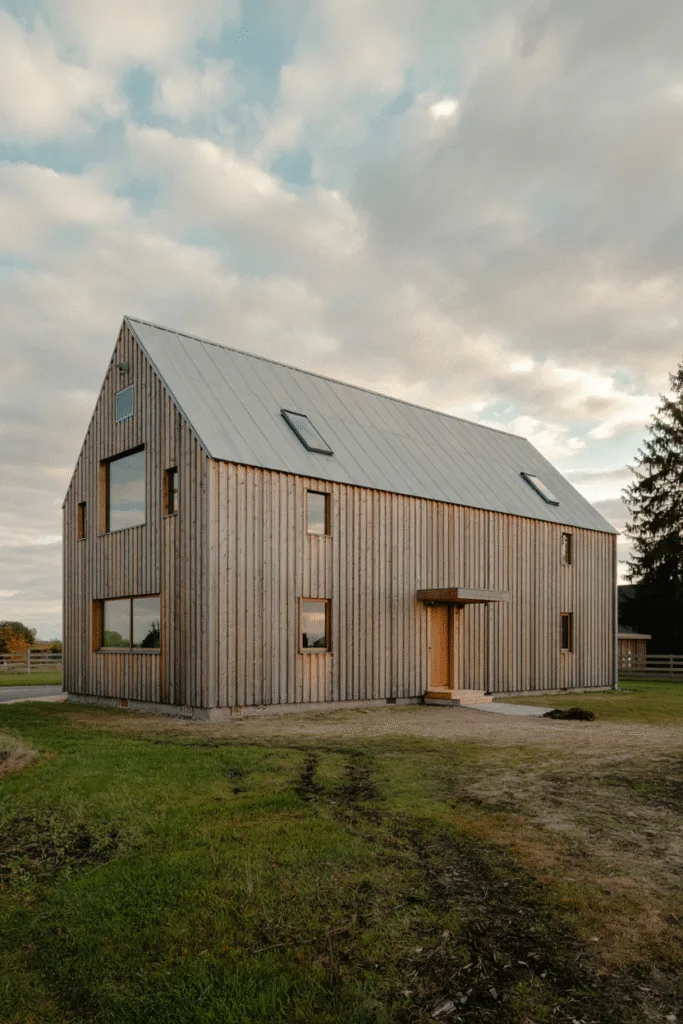Inspired by traditional barns, this rural home reinterprets the classic form with vertical cedar slats stained a soft gray. The slats cover the entire facade, including a pitched roofline, creating a monolithic yet warm appearance. Skylights and strategically placed windows ensure the interior remains bright and airy.