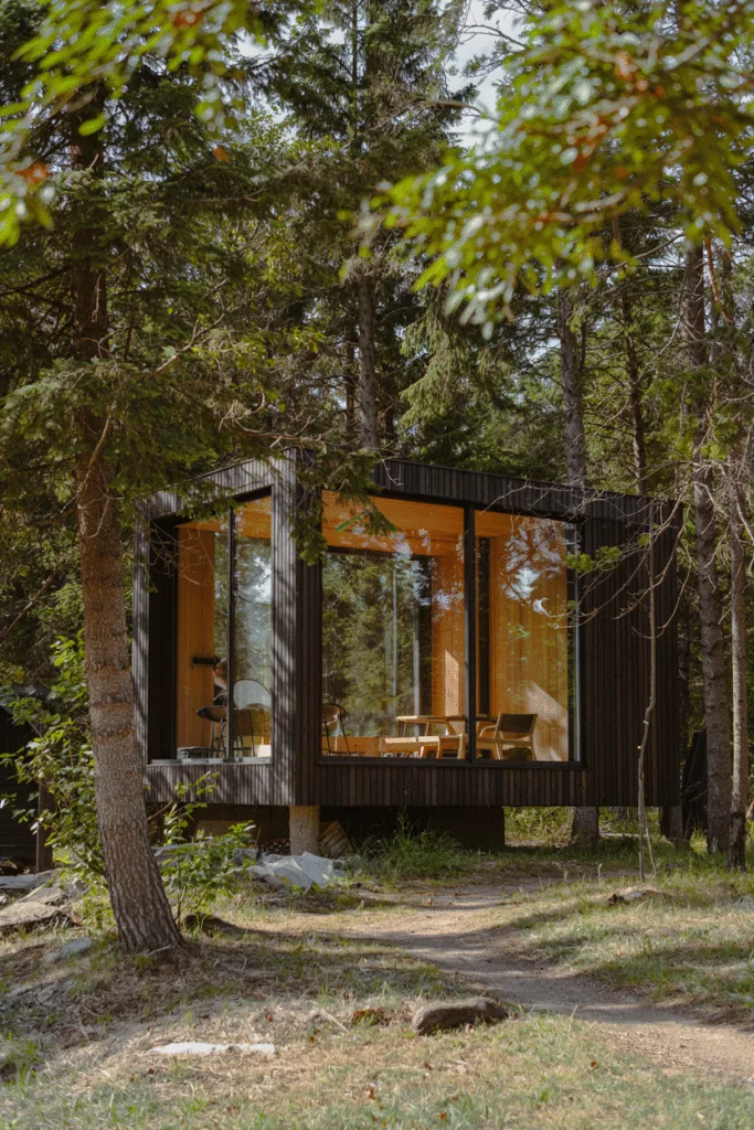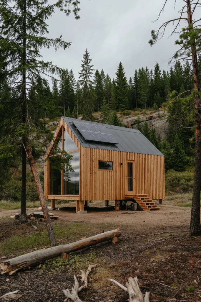 Located in a remote wilderness, this off-grid lodge uses vertical timber slats made from locally sourced pine. The slats are treated with natural oils to enhance durability, while their vertical orientation helps the structure blend into the forest. The design includes solar panels, a composting toilet, and rainwater collection for complete self-sufficiency.