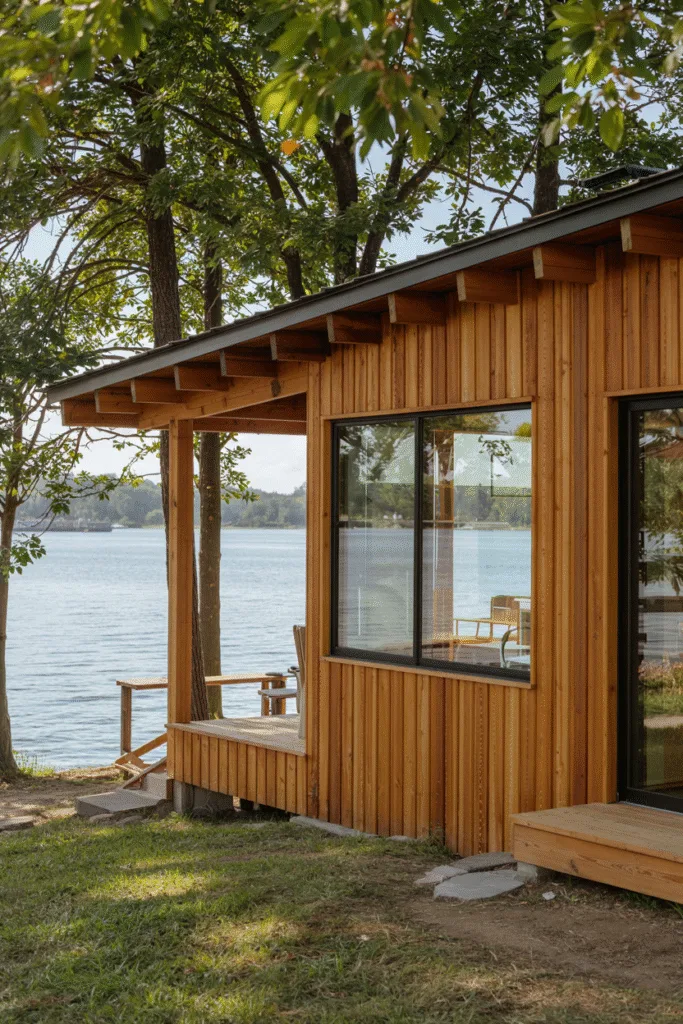 Overlooking a serene lake, this house features vertical pine slats stained a warm honey tone. The slats extend to form a covered porch, providing shade for outdoor gatherings. The design incorporates large windows that reflect the water’s surface, creating a harmonious connection with the environment.