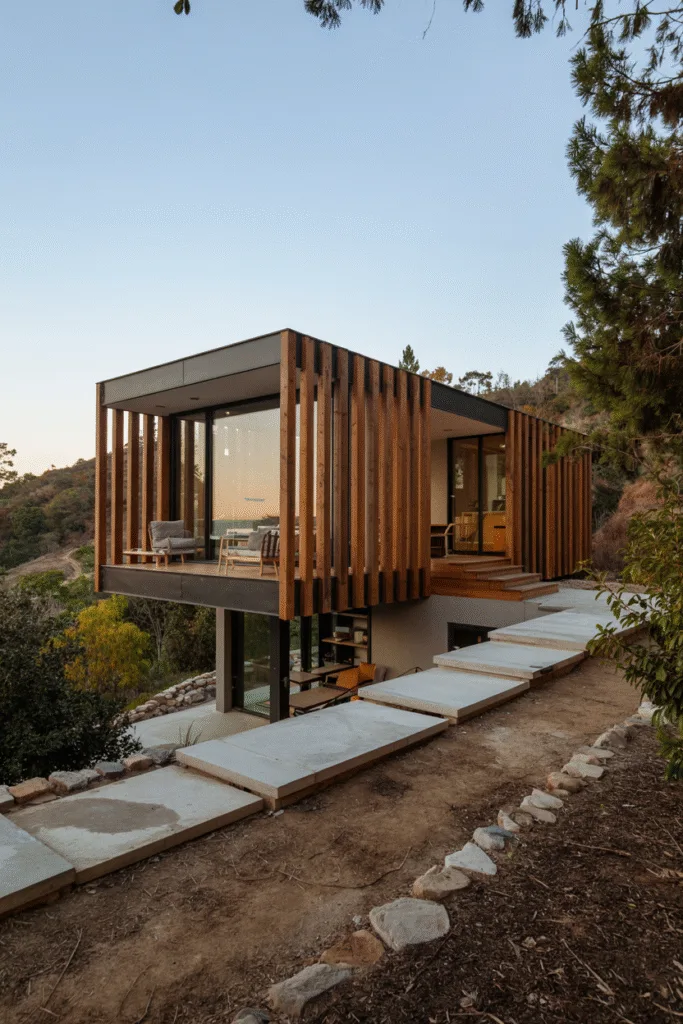 Perched on a hillside, this house uses vertical oak slats to create a dynamic facade that follows the terrain’s contours. The slats are spaced to frame views of the valley below, while a rooftop deck extends the living space outdoors. The design emphasizes sustainability with solar panels and rainwater harvesting systems.