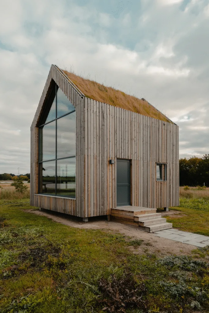 This compact, cube-shaped home prioritizes sustainability with reclaimed timber slats sourced from local barns. The vertical cladding is paired with a green roof, creating an eco-friendly aesthetic. The slats are spaced to maximize natural ventilation, reducing the need for mechanical cooling.