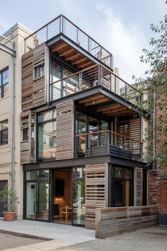 This multi-story urban loft uses reclaimed timber slats paired with exposed steel beams for an industrial-chic vibe. The vertical slats are unevenly spaced, adding a raw, organic texture to the otherwise stark facade. Large sliding glass doors allow the interior to spill onto a rooftop terrace, where the cladding extends to create privacy screens.