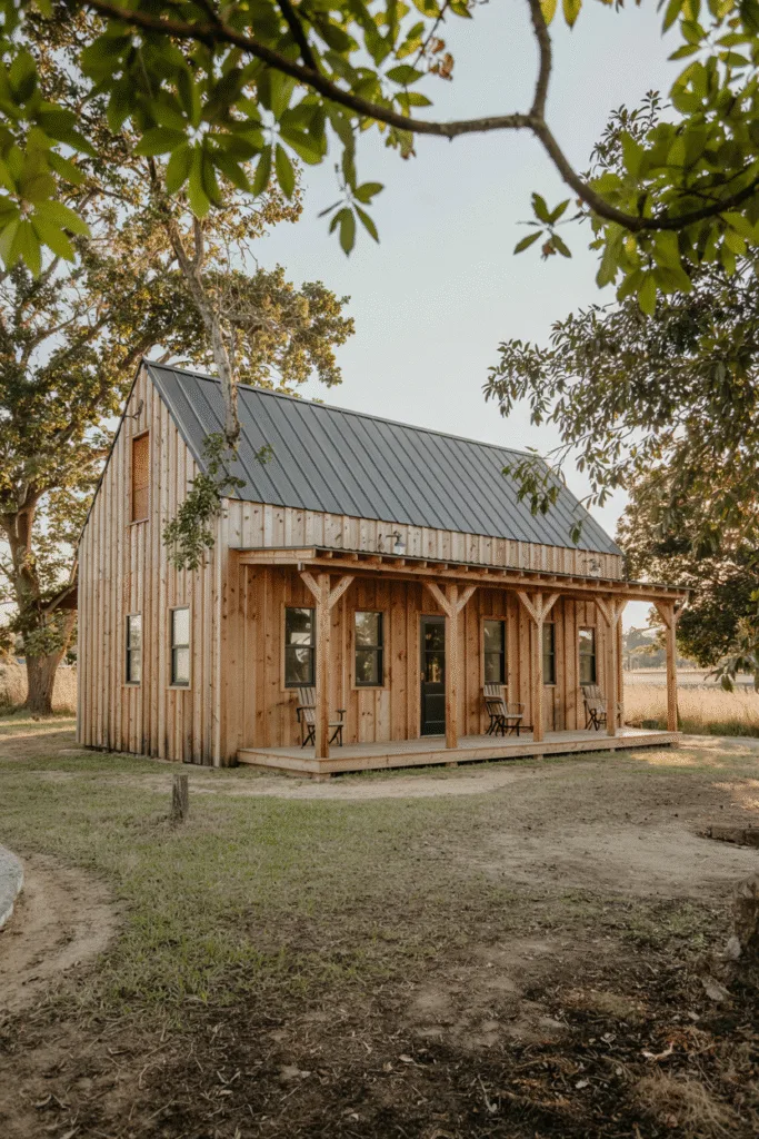 This reinterpretation of the classic farmhouse uses vertical timber slats to add a contemporary twist. The whitewashed pine slats contrast with a black metal roof, creating a striking yet timeless look. The design includes a wraparound porch, where the slats form a shaded seating area.