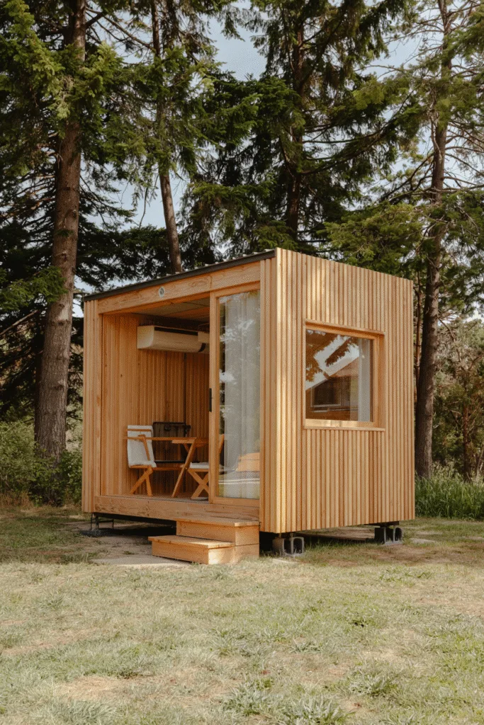 This small, modular home uses vertical timber slats to create a sense of grandeur despite its compact size. The slats are made from lightweight, composite timber, making the structure easy to assemble and relocate. The design maximizes space with built-in storage and foldable furniture, ideal for minimalist living.