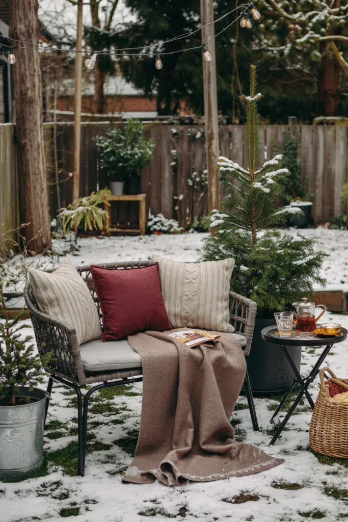 Create a cozy seating area with weatherproof furniture and insulated cushions. Add blankets or throws in rich winter tones like burgundy or forest green. This idea makes your small garden a functional extension of your home, perfect for sipping hot cocoa or reading on crisp mornings.