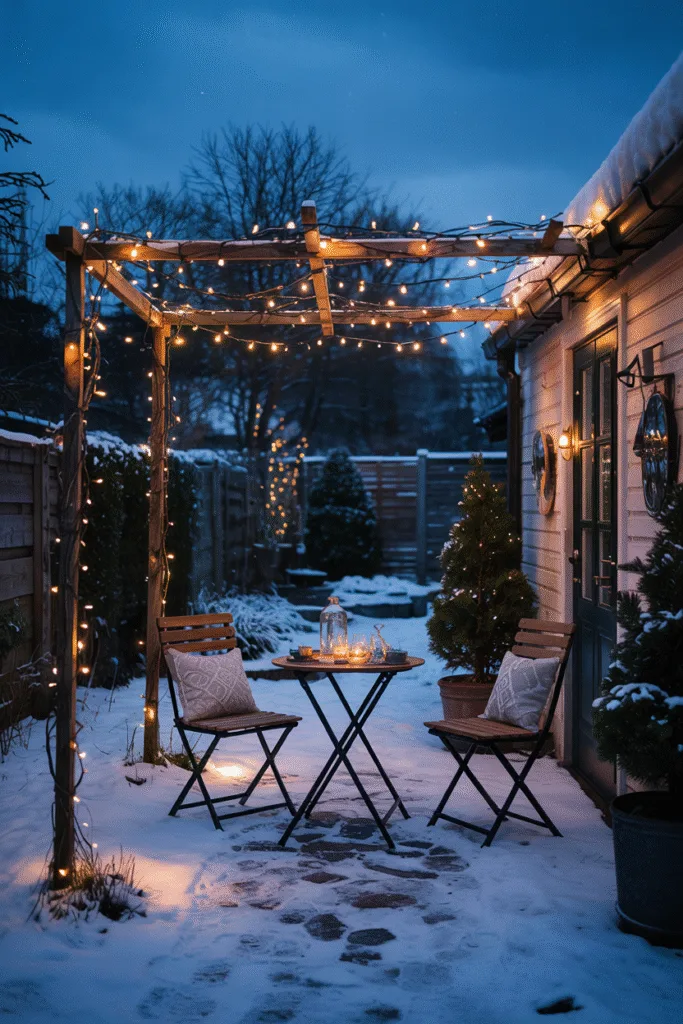 Create a magical ambiance with fairy lights draped over trellises, railings, or small trees. Opt for solar-powered or weatherproof LED lights to withstand winter conditions. This idea transforms your small garden into a cozy retreat for evening gatherings, making it feel larger and more inviting. Pair with reflective surfaces like mirrors to amplify the glow.
