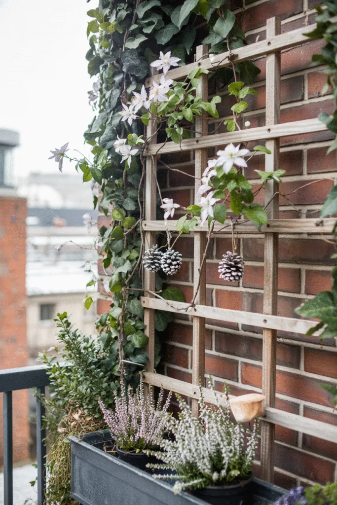 Maximize vertical space with trellises or wall-mounted planters. Grow climbing evergreens like ivy or winter clematis to create a living wall. This idea is perfect for tiny balconies or courtyards, adding greenery without sacrificing floor space. Add small hooks to hang seasonal decorations like pinecones or ornaments.