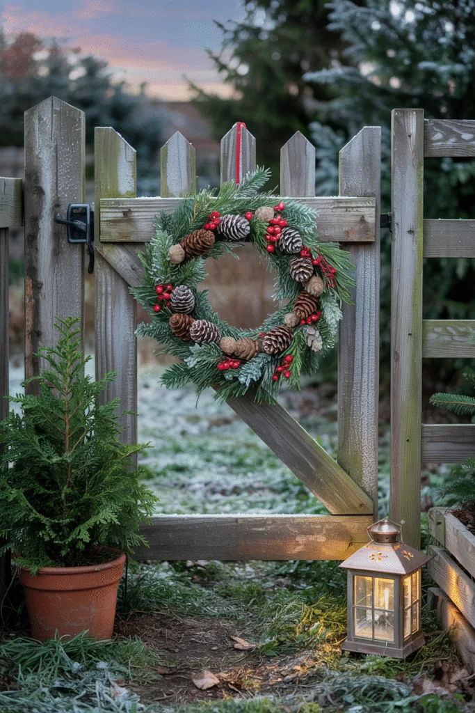 Hang handmade or store-bought wreaths made of evergreen boughs, pinecones, or dried berries on fences, doors, or walls. Rotate designs to reflect winter holidays or natural themes. This space-saving idea adds festive charm and can be customized to match your garden’s aesthetic.