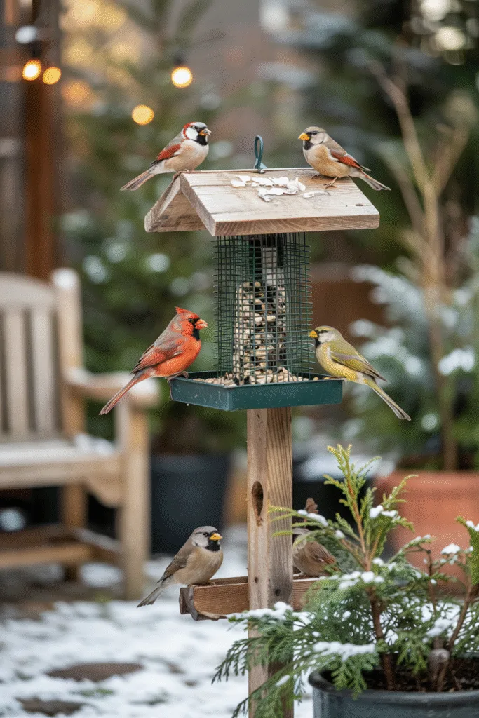 Invite wildlife to your garden with a heated bird feeder, which keeps water or seed accessible in freezing temperatures. Place it in a visible spot to enjoy watching birds from indoors. This low-maintenance idea adds ecological value and a sense of liveliness to your small winter garden.