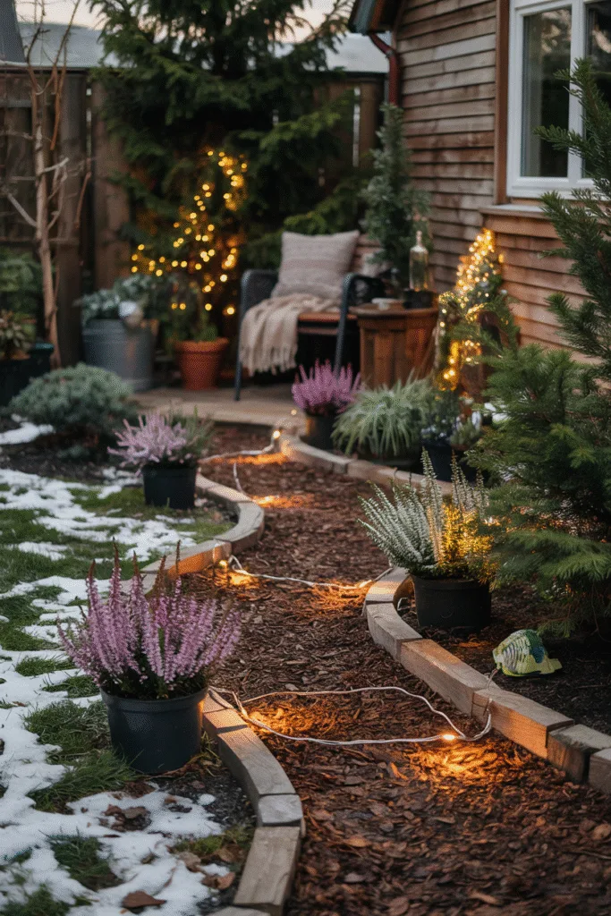 Define your small garden with mulched or gravel pathways lined with winter plants or lights. This creates a sense of structure and makes the space feel larger. Use bark chips or recycled materials for an eco-friendly touch, and ensure the path is slip-resistant for winter safety.