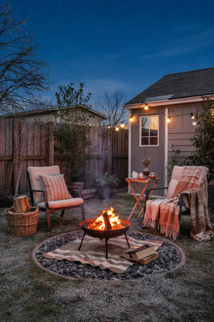 A: Add warm lighting (fairy lights, lanterns), a fire pit, and insulated seating with blankets to create an inviting atmosphere.