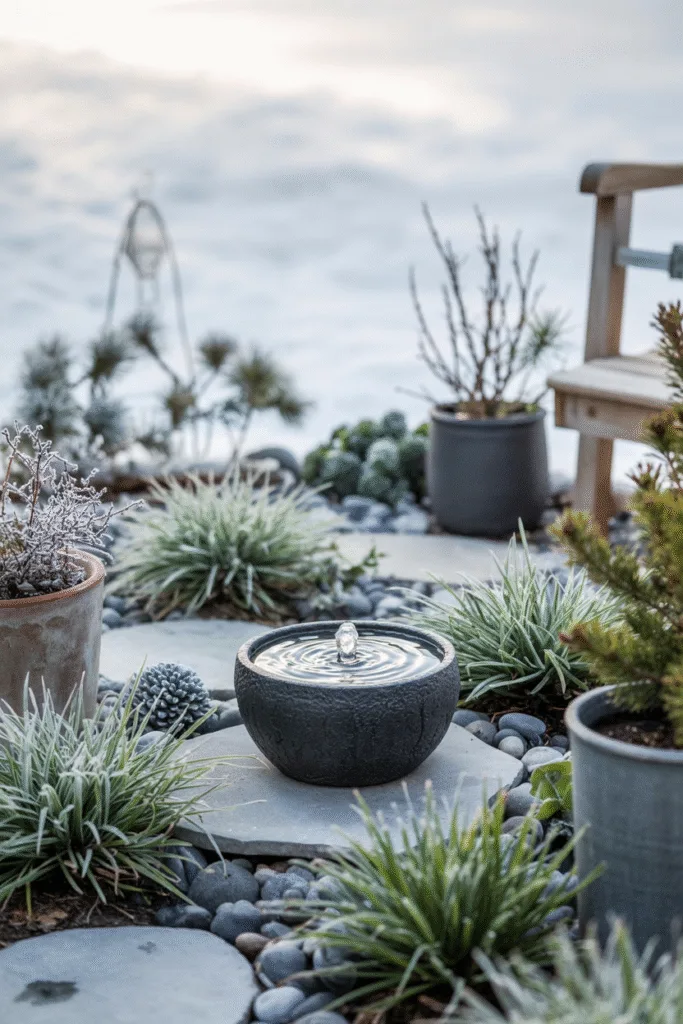 A small water feature, like a tabletop fountain or shallow basin, adds tranquility to your winter garden. Choose a solar-powered or freeze-resistant model to avoid damage. The reflective surface catches light, making your space feel larger and more serene, even in the depths of winter.