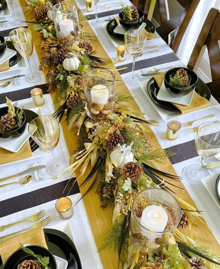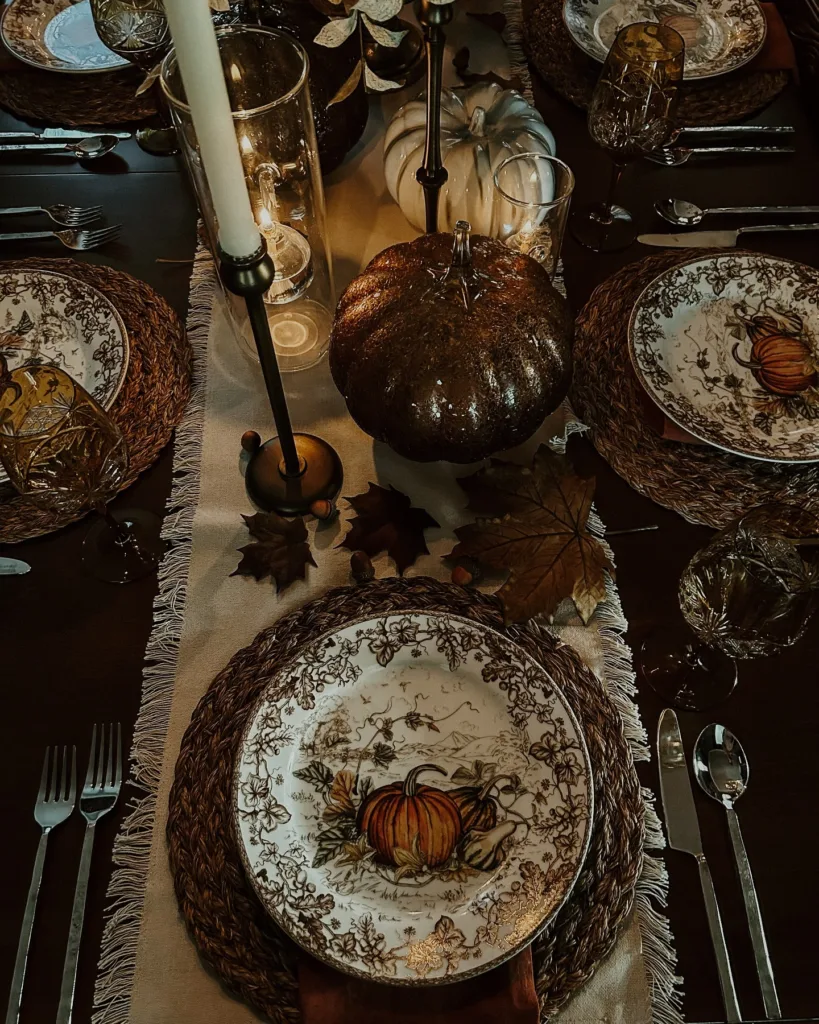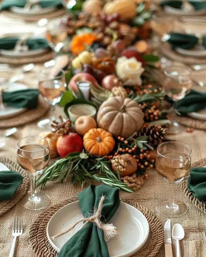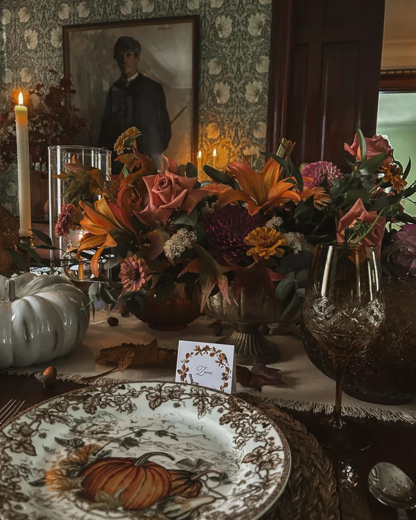The centerpiece is the table’s focal point, drawing eyes and evoking the season’s abundance. Skip oversized arrangements that block views; instead, go for low, lush designs under 12 inches tall.