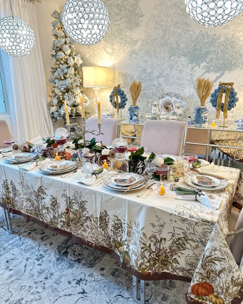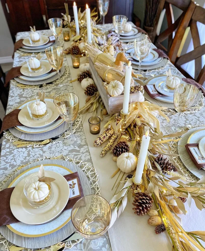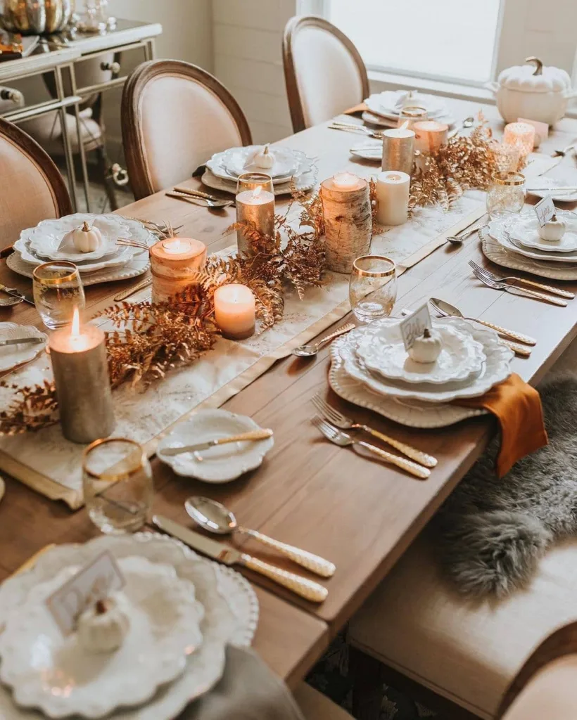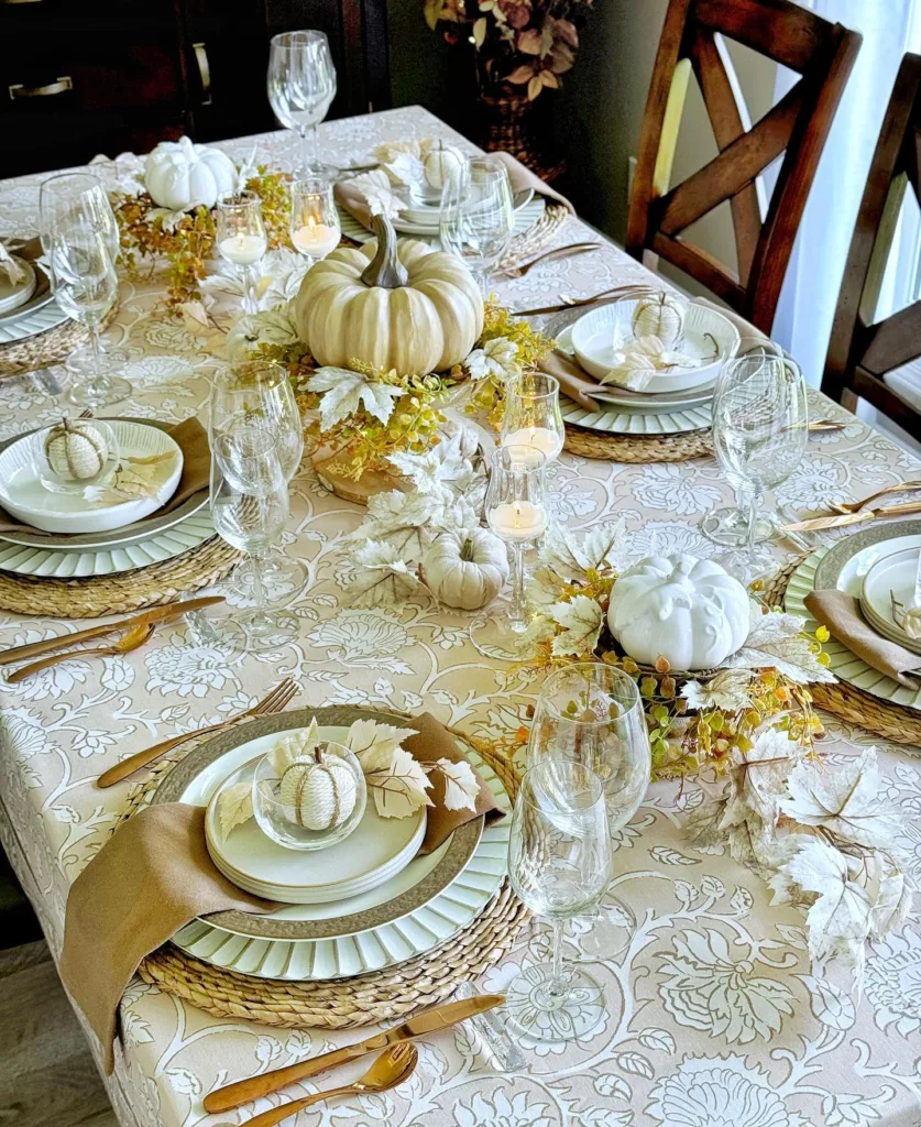 All-white with metallic sheens creates ethereal elegance. White pumpkins, silver flatware, and pearl accents keep it fresh for 2025.