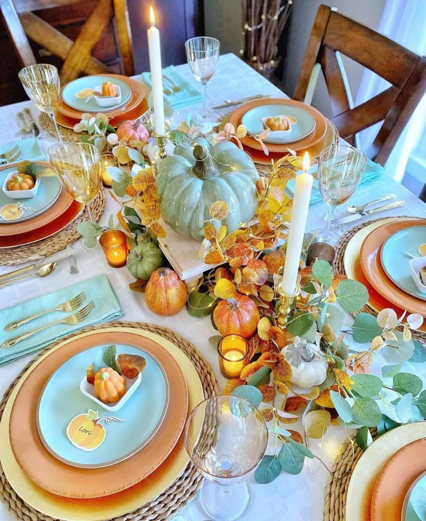 A vibrant fall tablescape with pumpkins and runners captures joyful abundance, inspired by @decorsteals and @itty_bitty_farmhouse.