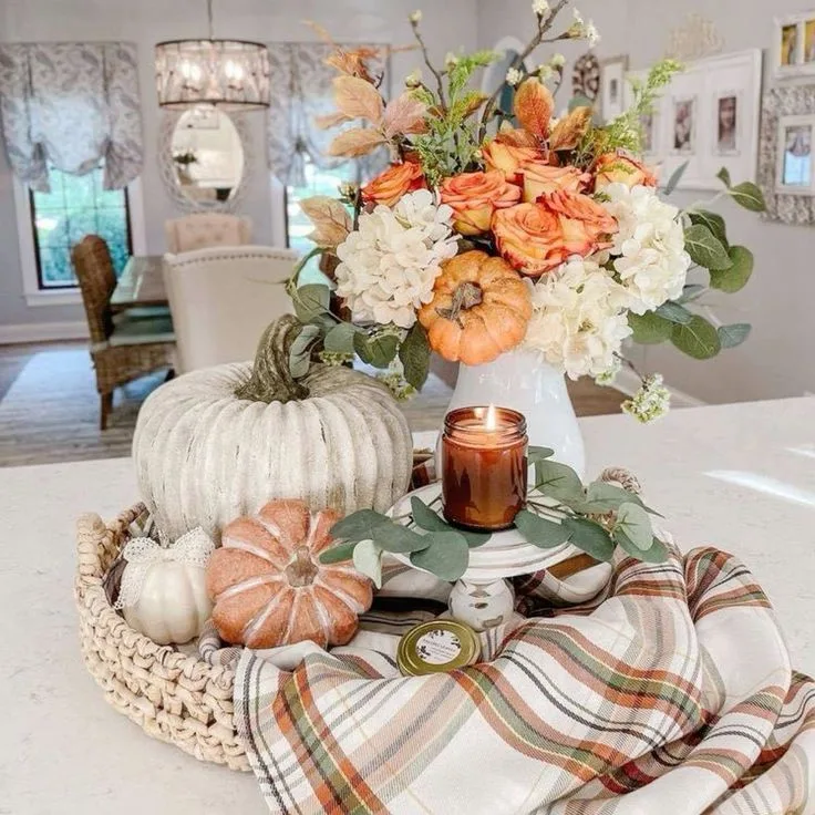 Fill wooden trays with apples, pears, and nuts, accented by brass candleholders. For variety, incorporate a colorful twist: vibrant orange pumpkins amid neutrals, creating contrast that pops against a monochromatic base.