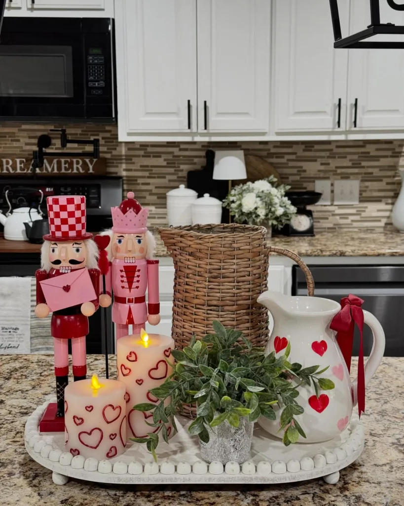 Replace snowflakes with hearts and swap neutral tones for pinks and reds. Keep evergreen elements but add romantic accents for a smooth shift.