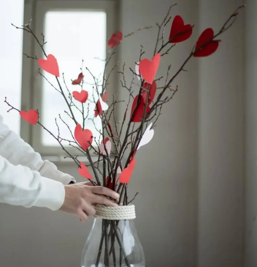A tall dried branch in a vase, hung with small red heart ornaments or paper cutouts—minimal but romantic.