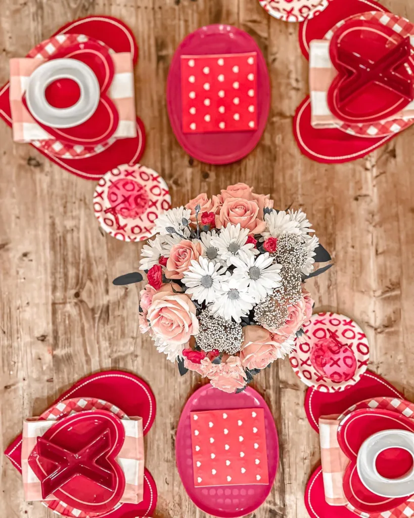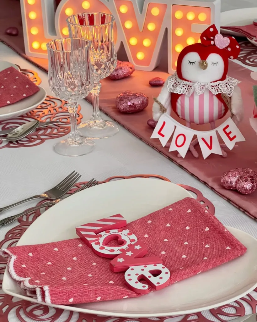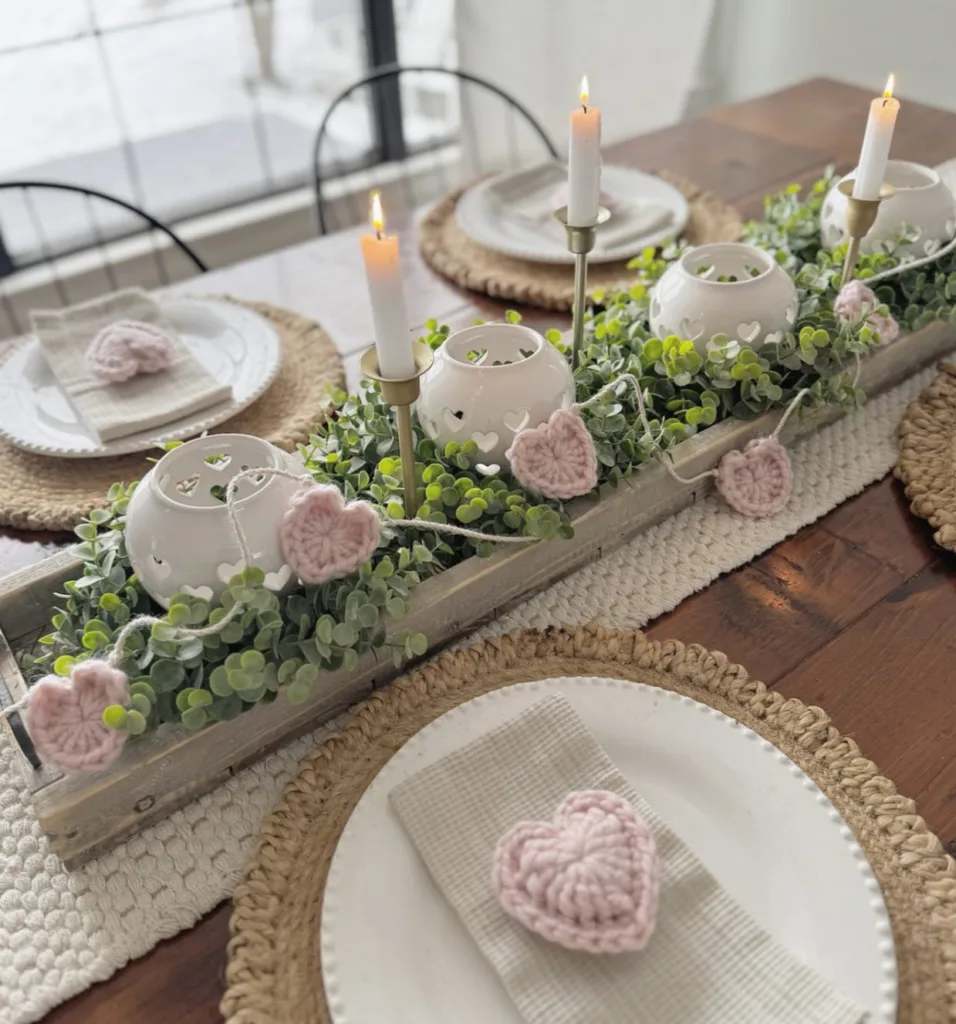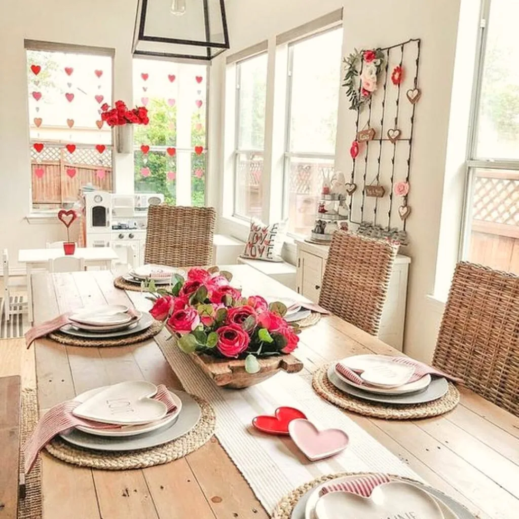 - Paper Heart Garland Runner – Hand-cut red and pink paper hearts strung across the table.