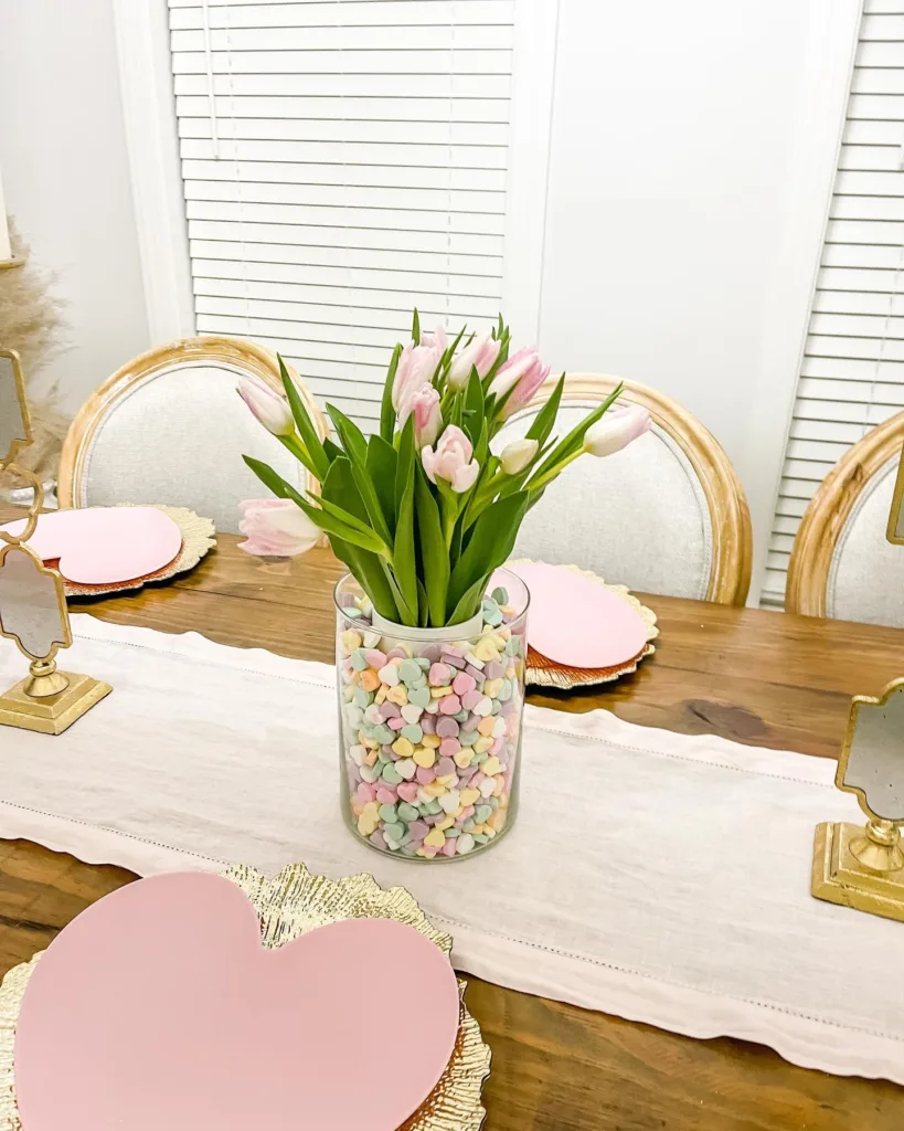 Glass jars filled with Valentine’s candies (hearts, chocolates) as centerpiece, topped with ribbon-tied bows.