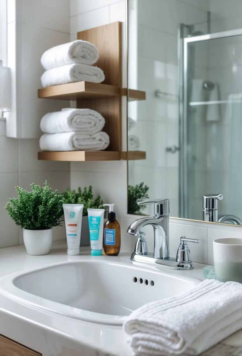 Store things in clear or labeled bins under the sink. A medicine cabinet or wall shelf keeps meds and skincare at eye level.