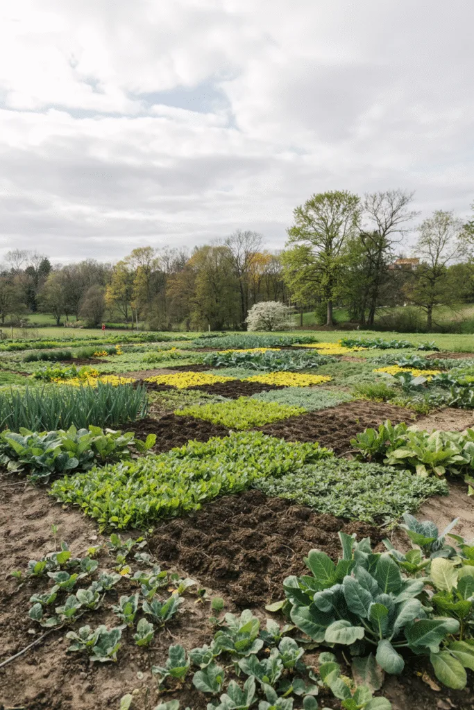 To keep my soil healthy, I use a checkerboard pattern for crop rotation. I alternate squares of nitrogen-fixing cover crops like clover with veggies like Brussels sprouts. Each season, I shift the crops to new squares. It’s a practical way to maintain soil fertility, and the alternating textures create a striking visual contrast.