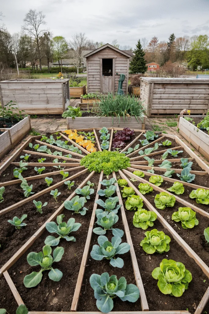 One winter, I got creative with a sunburst pattern, planting veggies in radiating wedges from a central point. I placed taller crops like Brussels sprouts in the center and shorter ones like lettuce on the outer edges. The radial design catches sunlight efficiently, and it’s a joy to look at from my kitchen window.