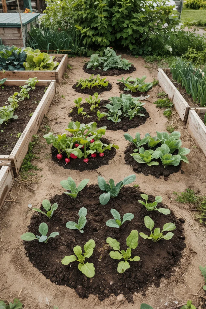 For a playful take, I created small, circular “polka dot” beds scattered across my plot. Each dot held a single crop, like a cluster of radishes or a patch of arugula. The randomness adds whimsy, and it’s easy to experiment with different veggies in each circle.